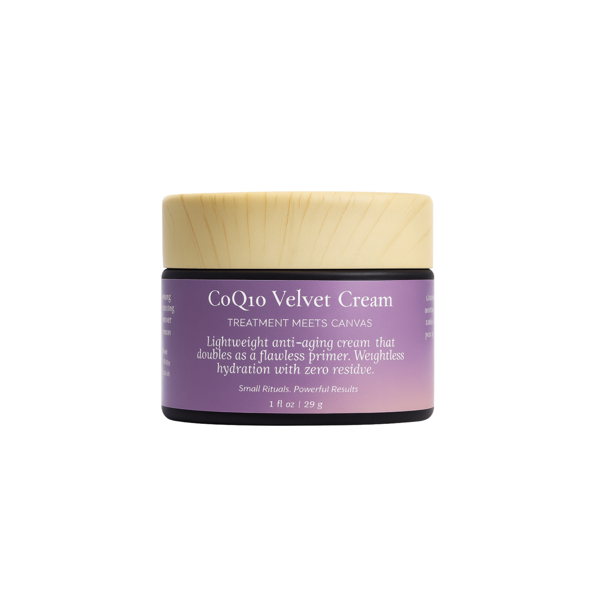 CoQ10 Velvet Cream is a lightweight anti-aging moisturizer that also works double duty as a flawless makeup primer. CoQ10, astaxanthin, and sea buckthorn oil deliver powerful antioxidant protection in a cream-to-gel formula that melts into skin, creating a smooth canvas with zero residue. Perfect alone or under makeup, it absorbs quickly, never pills, and leaves nothing but hydration and a soft-focus finish.