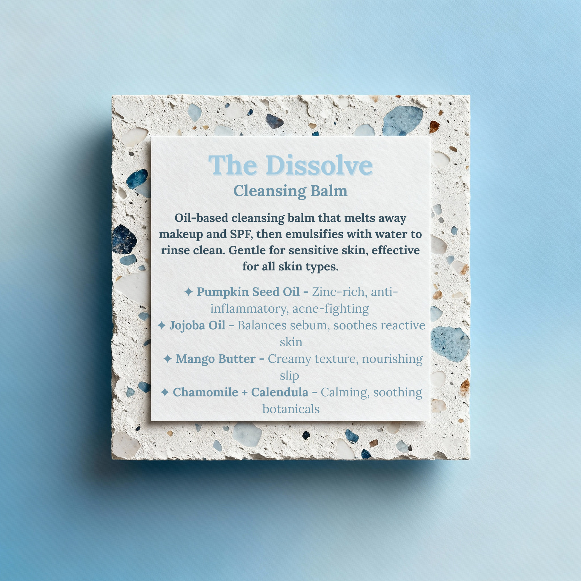 The Dissolve is a luxurious oil-based cleansing balm that melts away makeup, SPF, and daily buildup without stripping your skin. This transformative formula starts as a solid balm, melts into a silky oil on contact with skin, then emulsifies with water to rinse completely clean—leaving skin soft, balanced, and beautifully reset.